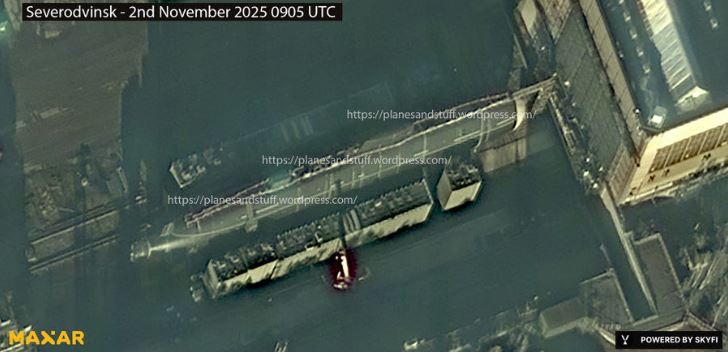 Trong ảnh, con tàu xuất hiện trên ụ trượt gần xưởng đóng tàu Sevmash – nơi đang thi công các tàu ngầm thuộc Dự án 09851. Ảnh vệ tinh được chụp một ngày sau khi Bộ Quốc phòng Nga thông báo hạ thủy tàu ngầm hạt nhân thế hệ mới Khabarovsk tại công ty liên doanh đóng tàu Sevmash, thành phố cảng Severodvinsk.
