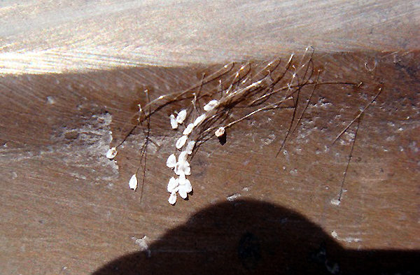 Trên lá cây, anh Thái đếm được 26 bông hoa, còn ở cửa tôn có 13 bông, bản lề cửa có 5 - 6 bông. Sau nhiều ngày mưa gió, 2 địa điểm là cửa tôn và bản lề còn lại khoảng 3 - 4 bông. Còn cây sống đời trồng trong nhà vẫn còn nguyên. Hoa có màu trắng, có cuống dài khoảng 5mm. Để nhìn rõ phải sử dụng kính lúp loại phóng to.