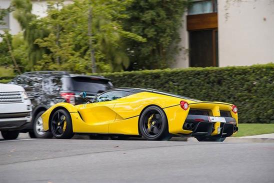 Chiếc siêu xe Ferrari LaFerrari màu vàng nằm trong sân căn biệt thự thuê tại Beverly Hills.