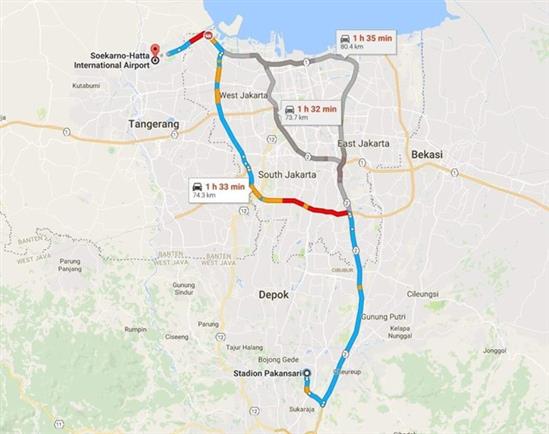 Theo tính toán của Google, thời gian từ sân bay quốc tế Sukarno - Hatta về địa điểm thi đấu mất 95 phút.