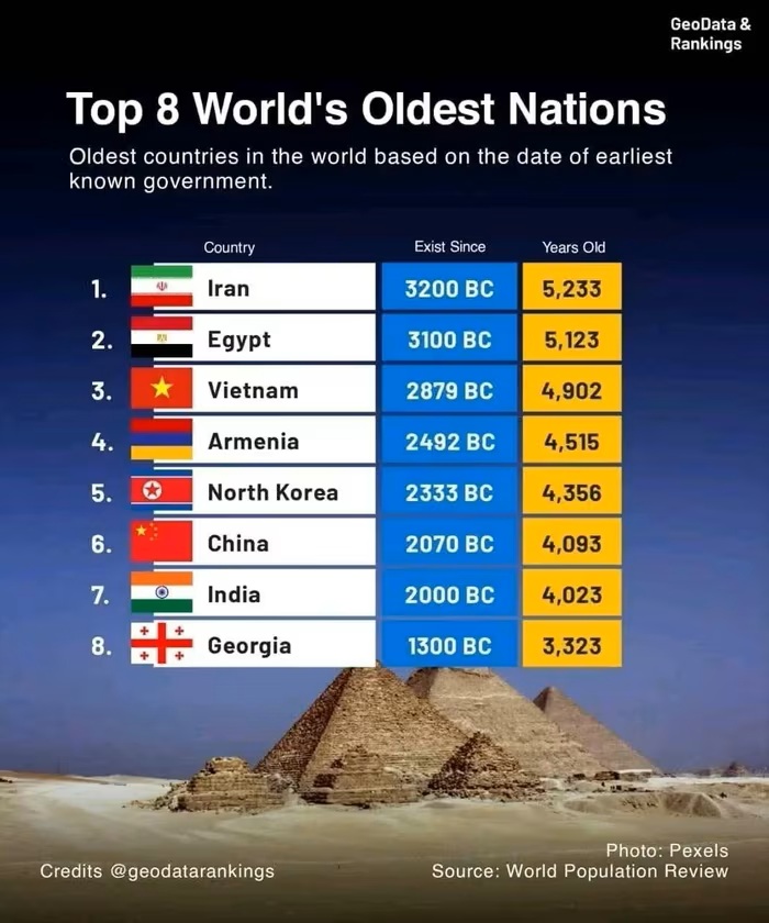 Iran, Ai Cập, Việt Nam, Armenia và Triều Tiên là những quốc gia được xem có lịch sử lâu đời bậc nhất thế giới, với dấu mốc hình thành từ hàng nghìn năm trước Công nguyên.