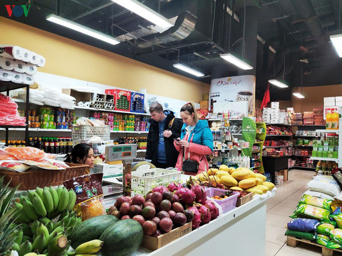 Tầng trệt của Trung tâm thương mại với những cửa hàng thực phẩm - trái cây Việt Nam không chỉ thu hút rất đông người Việt mà còn cả khách hàng Nga...