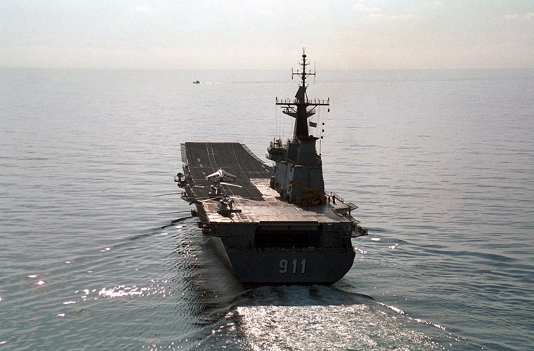 Năm 1992, Chính phủ Thái Lan đã ký hợp đồng với hãng Bazan (Tây Ban Nha) đóng mới tàu sân bay cho nước này với tổng trị giá hợp đồng 336 triệu USD. Năm 1997, Hải quân Thái Lan đã chính thức tiếp nhận chiếc tàu sân bay  mang tên HTMS Chakri Naruebet. Trong ảnh là tàu sân bay HTMS Chakri Naruebet (số hiệu 911) trong hoạt động diễn tập với Hải quân Mỹ.