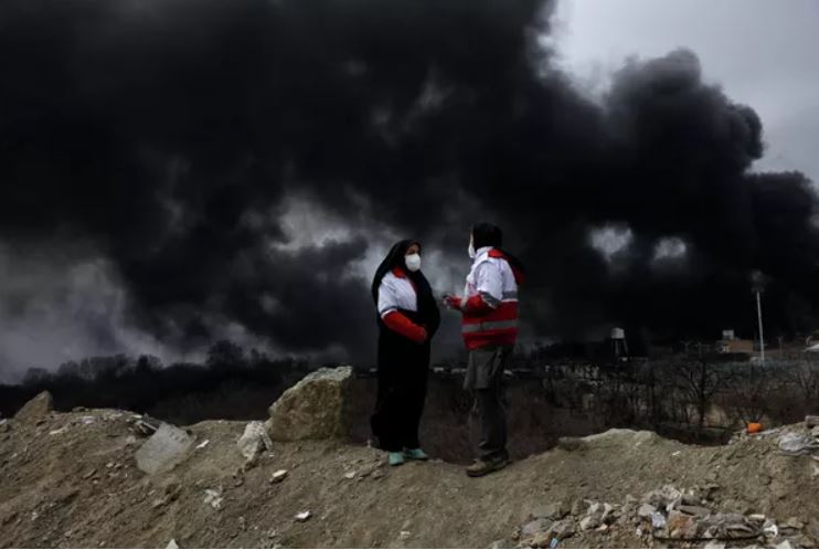 Các thành viên Hội Chữ thập đỏ nói chuyện với nhau khi khói bốc lên sau một vụ tấn công được báo cáo vào các bể chứa nhiên liệu ở Shahran, Iran. © REUTERS Majid Asgaripour