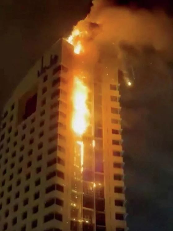 Khói bốc lên từ một tòa nhà đang cháy sau vụ tấn công bằng máy bay không người lái mà quân đội Kuwait công nhận trong bối cảnh xung đột Mỹ-Israel với Iran ở thành phố Kuwait.
