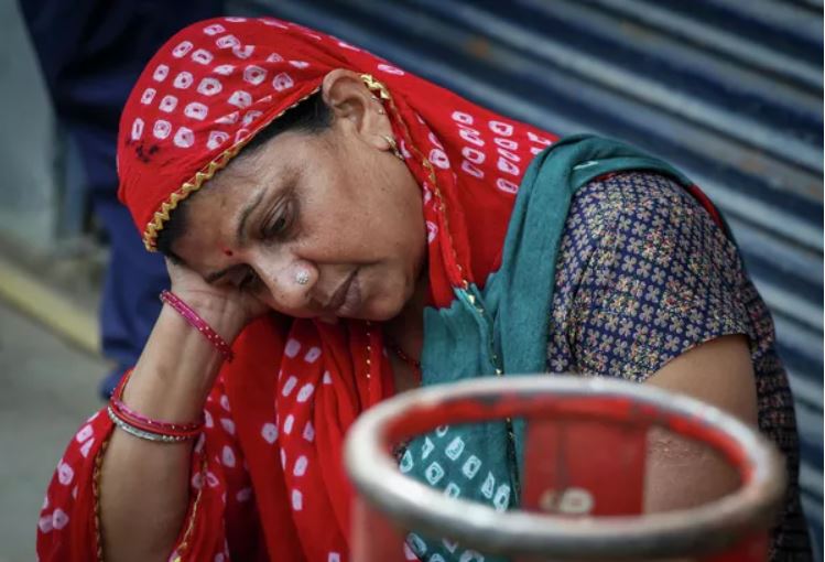 Một người phụ nữ ngồi cạnh bình khí hóa lỏng đã hết, Ấn Độ. © REUTERS Bhawika Chhabra