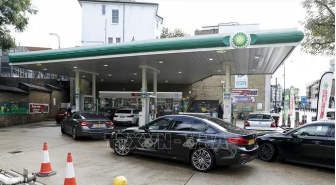 Các phương tiện xếp hàng chờ đổ xăng tại một trạm xăng ở London, Anh .