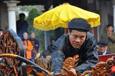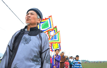 Đi đầu đoàn rước là ông chủ tế (người hướng dẫn và chủ trì làm lễ Khai Hạ)…