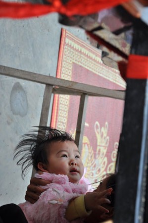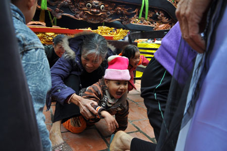 Chị Nguyễn Thị Minh (quê Yên Mô, Ninh Bình) đang cố bế con nhỏ của mình chui qua kiệu để xin được nhiều may mắn cho gia đình mình trong năm mới.