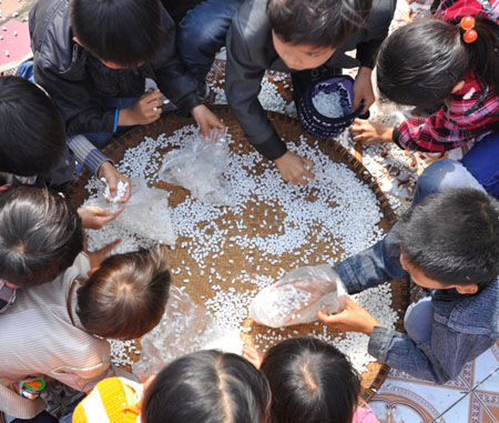 Sau khi làm xong lễ, bổng lộc, kẹo bánh sẽ được phân phát cho những trẻ em có mặt trong lễ hội.