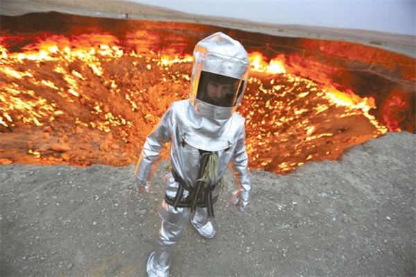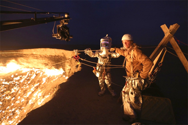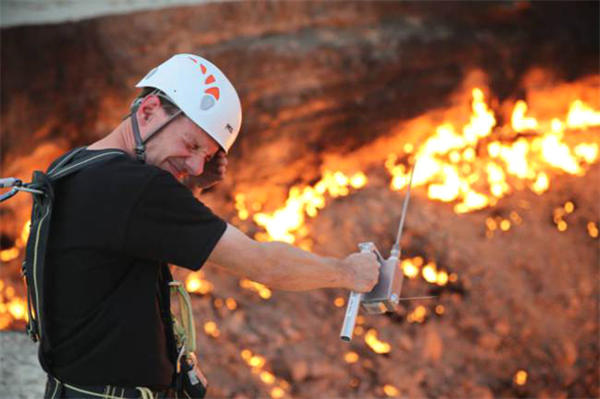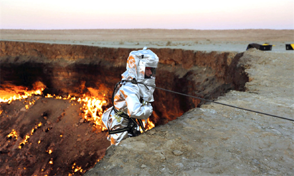 Nhà thám hiểm George Kourounis đã trở thành người đầu tiên khám phá miệng hố bốc cháy trong sa mạc ở Turkmenistan.