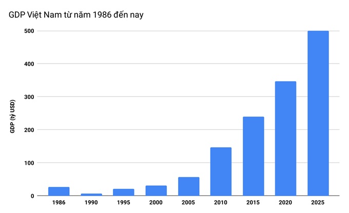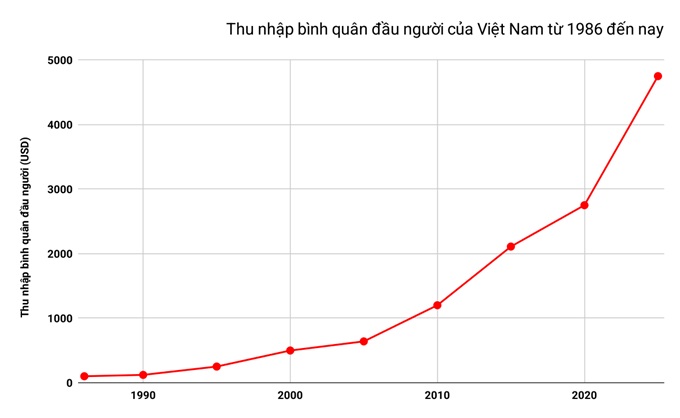 Biểu đồ tăng trưởng GDP và thu nhập bình quân đầu người của Việt Nam từ năm 1986 đến 2025. Ảnh: Lộc Liên.