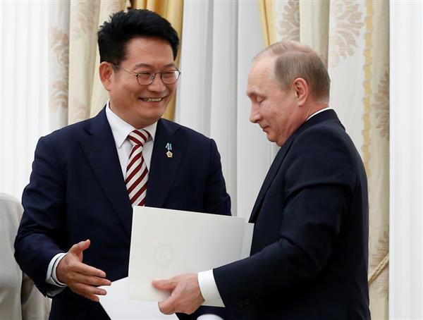 Đặc phái viên Song Young Gil của Tổng thống Hàn Quốc Moon Jae In gặp Tổng thống Nga Putin (phải) ngày 24/5 tại Moscow. Ảnh: Getty.