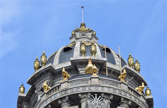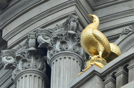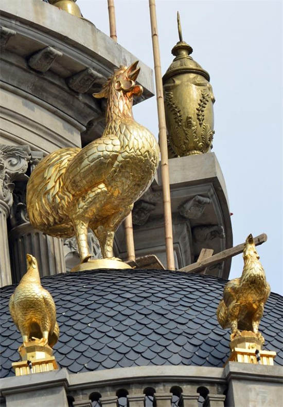 Điểm đặc biệt của tòa nhà này là được gắn 6 con gà và một số đồ trang trí trên nóc. Tất cả đều được dát vàng.