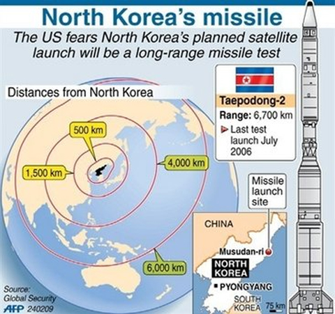 Hình vẽ này mô tả tầm hoạt động của tên lửa Taepodong-2 - Đồ họa: Global Security/AFP