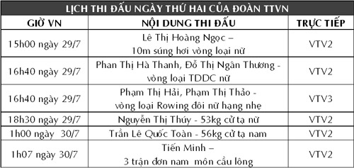 Trong khi đó, lúc 16h40 giờ Việt Nam, hai nữ tuyển thủ Phạm Thị Hải và Phạm Thị Thảo sẽ tranh vòng loại nội dung thuyền đôi nhẹ môn rowing. Còn nữ xạ thủ Lê Thị Hoàng Ngọc sẽ tranh vòng loại 10m súng ngắn hơi lúc 15h00 (giờ Việt Nam).