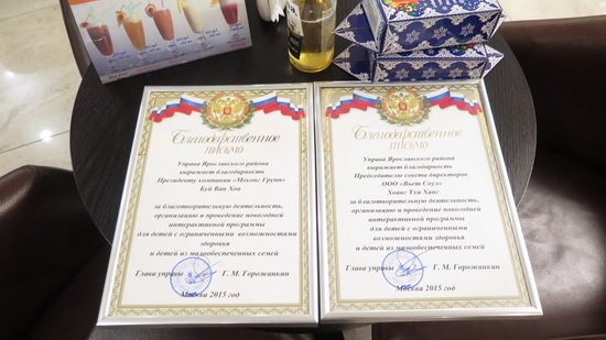 Đánh giá cao ý tưởng và hoạt động này, thay mặt Ban lãnh đạo Khu Yaroslav, ông Batrakov đã trao những Thư khen cho Tổng Giám đốc Tập đoàn Mêkông - Bùi Văn Hòa và Giám đốc Nhà hàng Hồn Việt - Hoàng Thị Hằng cùng một số nhân viên của Nhà Hàng. Nói về hoạt động đặc biệt này, ông Batrakov khẳng định: