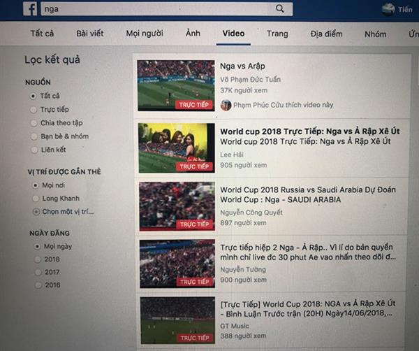 Chỉ với từ khóa "Nga", người dùng có thể thấy hàng trăm trang Facebook đang thực hiện livestream trái phép trận đấu giữa Nga và Ả Rập Saudi.