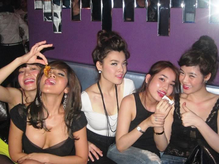 Julia Hồ Thúy Anh (bên phải) đang dựa vào ngực một người bạn gái cũng ăn mặc rất "mát mẻ".