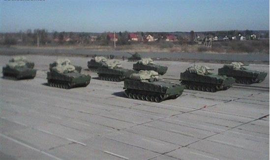 Ngoài ra, ở ngoại ô Moscow, lực lượng lục quân Nga cũng đang tiến hành những bước chuẩn bị cuối cùng cho cuộc duyệt binh lịch sử ngày 9-5 cùng với hàng loạt trang bị khác như xe chiến đấu bộ binh B-11 Kurganets-25 (Project 695), xe chiến đấu bộ binh hạng nặng T-15 Armata (Project 149), xe chiến đấu bộ binh BMD-4M (Project 960). Ảnh: Dàn tăng thiết giáp Nga chuẩn bị cho lễ duyệt binh
