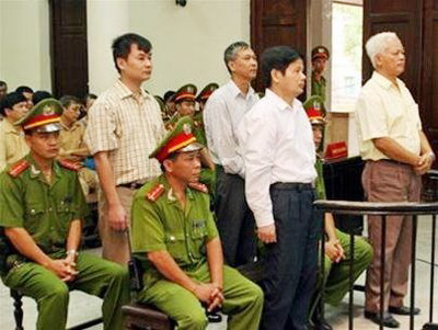Nhà báo Nguyễn Văn Hải, Nguyễn Việt Chiến (đứng hàng dưới) trong phiên tòa "hậu PMU18".