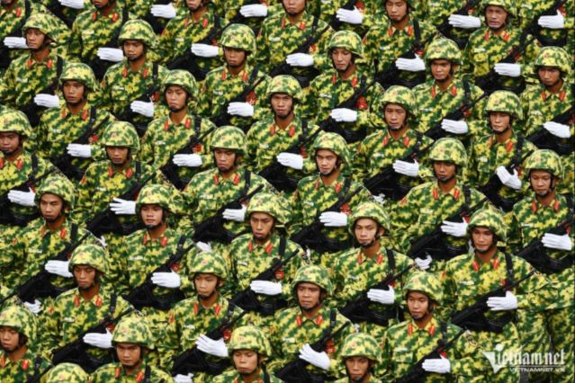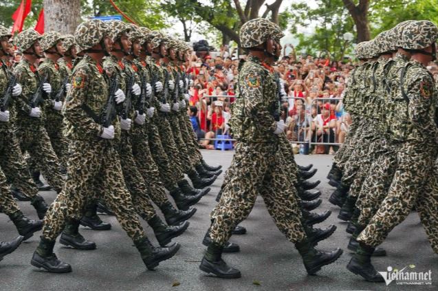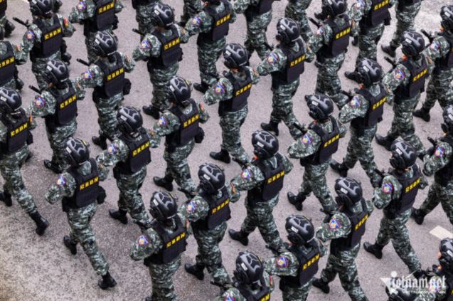 Các đội hình hôm nay đã đi đều và đẹp đạt chuẩn. Nổi bật là khối nam chiến sĩ Phòng hóa, đại diện cho lực lượng Binh chủng Hóa học của Quân đội nhân dân Việt Nam. Đây là lực lượng chuyên trách làm nhiệm vụ phòng chống, khắc phục hậu quả vũ khí hủy diệt lớn như vũ khí hạt nhân, hóa học, sinh học; ứng cứu sự cố hóa chất độc hại, phóng xạ, môi trường trong thời bình; khói ngụy trang, tạo màn che phục vụ tác chiến, bảo vệ đội hình và trang thiết bị và khử độc, tẩy xạ, tẩy trùng trang bị, phương tiện, công trình sau khi bị nhiễm. Ảnh: Hoàng Hà.