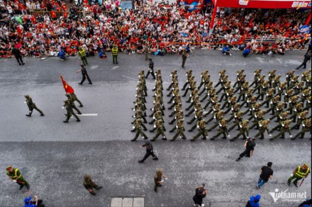 Đoạn giao giữa phố Nguyễn Thái Học và Điện Biên Phủ là một trong số ít địa điểm xem được nhiều khối nhất và thu hút lượng người dân khá lớn. Trong ảnh là khối chiến sĩ Công binh.