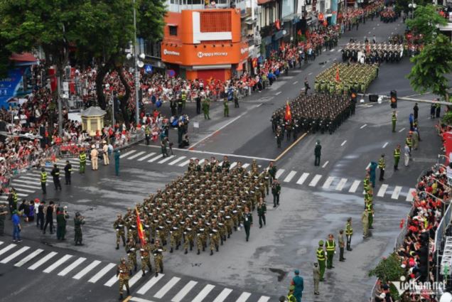Hướng Nguyễn Thái Học - ngã 7 Cửa Nam - Tràng Thi - Tràng Tiền - Quảng trường Cách mạng Tháng Tám là 16 khối tiêu biểu, đại diện cho các lực lượng nòng cốt của Quân đội nhân dân Việt Nam. Ảnh: Hoàng Hà.