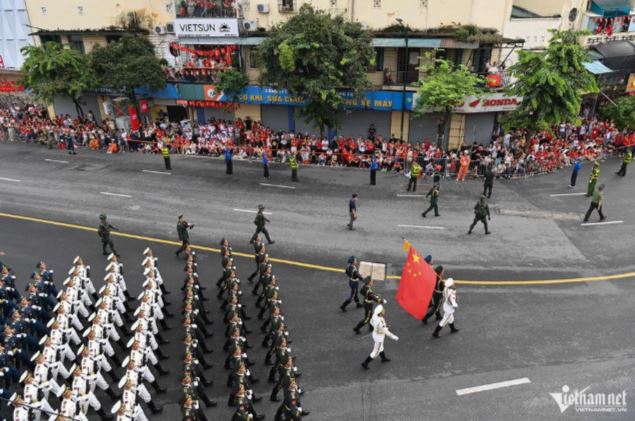 Nhiều người dân hai bên đường đã tập trung từ 12h trưa, thậm chí có người đến từ 6h sáng 29/8 để chờ đợi xem được khoảnh khắc hùng dũng này. Trong ảnh, đoàn Quân Giải phóng Nhân dân Trung Quốc đi qua ngã 7 Cửa Nam. Ảnh: Giang Trịnh.