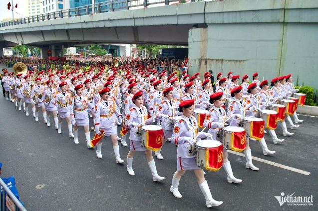 Khối nữ Quân nhạc luôn thu hút sự chú ý của khán giả bởi nét xinh tươi, duyên dáng của các cô gái. Khối nữ Quân nhạc trong đội hình diễu binh là lực lượng đặc biệt mang tính nghi lễ, văn hóa, tinh thần, đại diện cho hình ảnh người phụ nữ Quân đội nhân dân Việt Nam “giỏi việc nước, đảm việc nhà” và giàu chất nghệ sĩ. Ảnh: Thế Sơn.