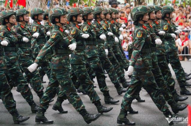 Trong số đoàn quân tiến về quảng trường Cách mạng Tháng Tám có khối nữ sĩ quan Gìn giữ hòa bình. Đây là biểu tượng của sự hội nhập quốc tế, hòa bình, nhân văn, tô điểm thêm nét đẹp trí tuệ, bản lĩnh trong đội hình trang nghiêm, thể hiện sự đóng góp của phụ nữ Việt Nam không chỉ trong nước mà còn trên trường quốc tế. Ảnh: Thạch Thảo.