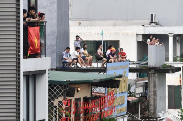 Trên nhiều nhà cao tầng dọc tuyến phố có đoàn diễu binh đi qua, người dân tận dụng mọi vị trí thoáng đãng để quan sát buổi tổng duyệt. Ảnh: Hoàng Hà.