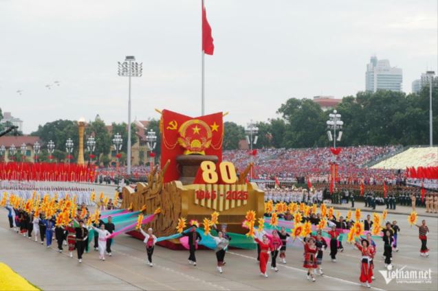 Mở màn lễ diễu binh, diễu hành là sự xuất hiện của khối Nghi trượng với các hình ảnh biểu trưng như 80 năm Quốc khánh, Việt Nam bước vào kỷ nguyên phát triển mới và đội hình