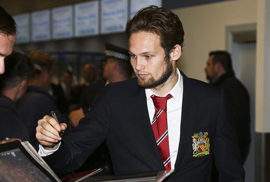 Thầy trò Louis van Gaal diện trang phục với biểu tượng khá độc đáo trong chuyến đi đến Nga làm khách CSKA Moskva ở Champions League.