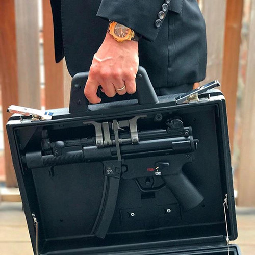 Với thiết kế của "Hộ Tống" ngày này nhiều loại súng tiểu liên cỡ nhỏ như UZI hay MP5 cũng được gắn vào các vali ngụy trang, tuy nhiên chúng được cải tiến để tiện lợi hơn khi có khả năng khai hỏa ngay từ bên trong vali mà không cần phải bỏ ra ngoài. Nguồn ảnh: Websta.