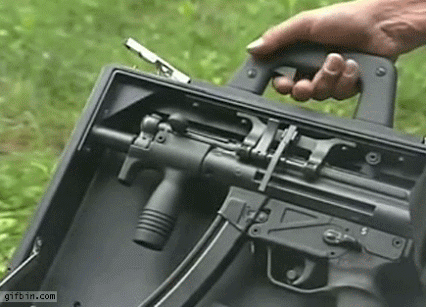 Cơ chế bắn từ bên trong vali của khẩu MP5, đặc vụ sẽ không cần phải rút hẳn súng ra mà vẫn có được hỏa lực áp chế đối phương. Nguồn ảnh: Gifin.