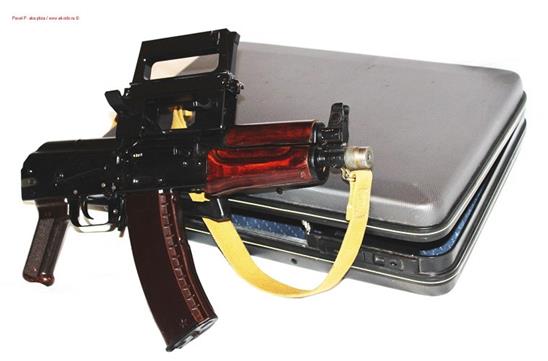 Khẩu AKS-74U sẽ được để bên trong vali một cách gọn gàng với băng đạn và chốt an toàn mở sẵn, phần quai xách của vali sẽ được gắn trực tiếp vào súng và có một chốt để bật tung chiếc vali ra. Nguồn ảnh: Firearm.