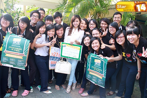Ngay khi nhận ra "nữ hiệp Hoa Xuân" các teen lập tức phấn khích và nhanh chóng "tiếp cận" để xin chữ kí cũng như "pose" ảnh kỉ niệm cùng. Thậm chí, đến khi reng chuông vào lớp mà các bạn vẫn còn nấn ná không muốn rời đi nữa cơ! Trước tình huống bất ngờ bị "bao vây", Midu vẫn luôn nở nụ cười rạng rỡ và thân thiện kí tặng cho từng fan hâm mộ.