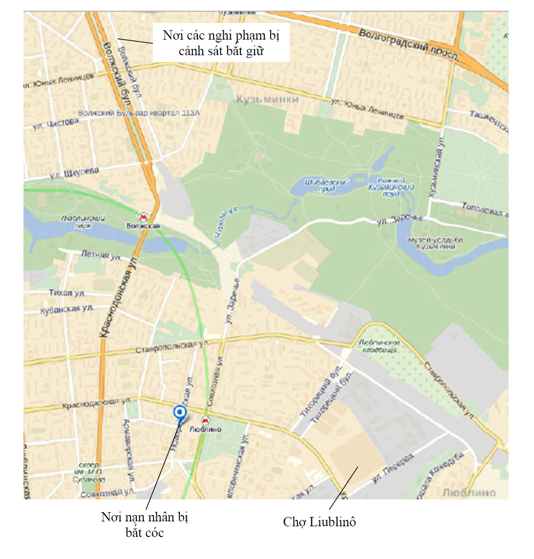 Bản đồ khu nạn nhân bị bắt cóc và các nghi phạm bị bắt giữ  (nguồn yandex.ru)