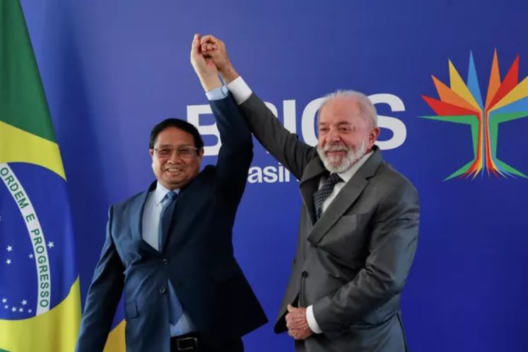 Tổng thống Brazil Luiz Inácio Lula da Silva chào đón Thủ tướng Việt Nam Phạm Minh Chính trong cuộc gặp song phương trước thềm Hội nghị Thượng đỉnh BRICS tại Rio de Janeiro, Brazil. © AP Photo / Bruna Prado
