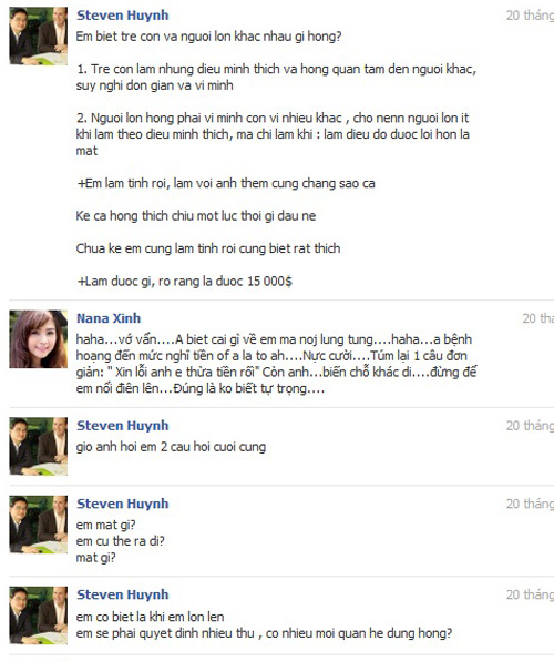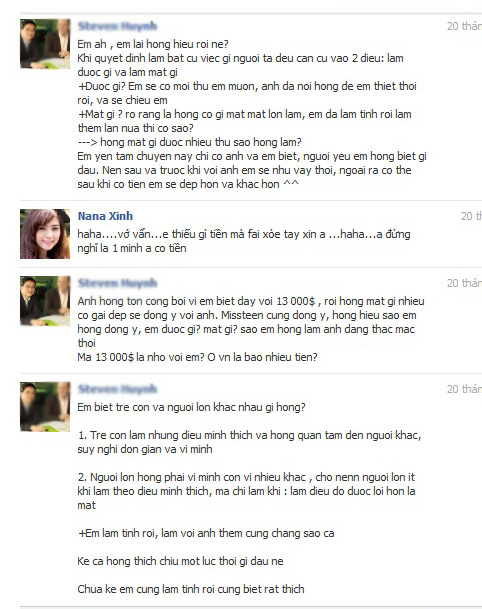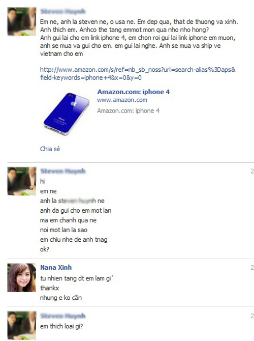 Cũng có nhiều “đại gia” trực tiếp nhắn tin vào facebook. Ban đầu, họ gợi ý muốn tặng những món quà đắt tiền như Iphone, macbook, hàng hiệu để làm quen. Sau đó, họ đưa ra giá cả cụ thể để thăm dò ý kiến của Nana.