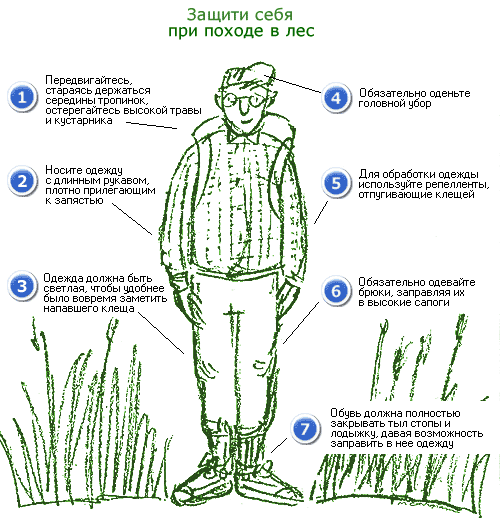 Các chuyên gia khuyến cáo người dân khi đi vào các khu rừng rậm, để ngăn ngừa ve đốt, nên ăn mặc kín đáo, có mũ trùm hoặc sử dụng các loại quần áo chuyên dụng (hiệu  "Biostop") hoặc  các loại thuốc xoa thuốc ngoài da (Крем против клещей : "Бибан" (Словения), "ДЭФИ-Тайга" (Россия), "Офф! Экстрим" (Италия), "Галл-РЭТ" (Россия), "Гал-РЭТ-кл" (Россия), "Дэта-ВОККО" (Россия), "Рефтамид максимум" (Россия)).  Ngoài ra nên kiểm tra quần áo, đầu tóc thường xuyên khi đi vào các khu rừng.