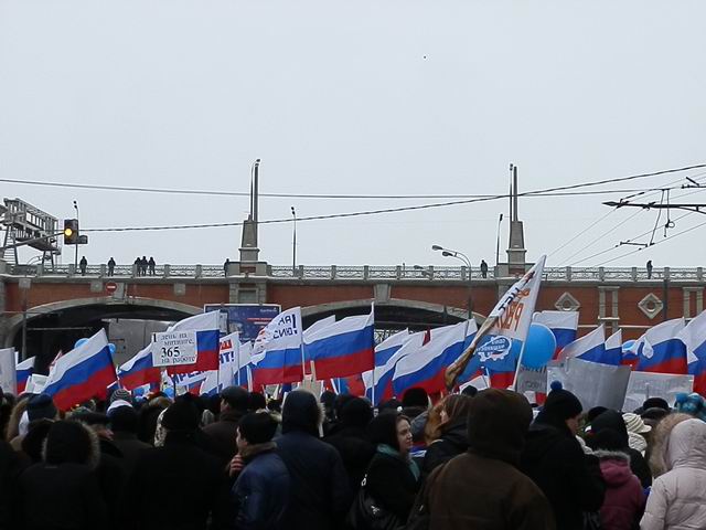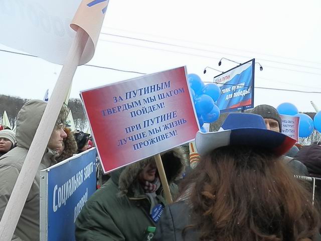 Như tin đã đưa, sau khi tập trung tuần hành trên phố bờ sông Phrun-zen-skaia, những người tham gia tuần hành đã tập trung về sân vận động Lu-giơ-nhi-ki tiếp tục tổ chức mít tinh ủng hộ chính sách của chính phủ Nga, ủng hộ ứng cử viên tổng thống, đương kim thủ tướng Pu-tin. Cuộc mít tinh này diễn ra dưới khẩu hiệu “Chúng ta bảo vệ nước Nga” và được bắt đầu bằng bản quốc ca Nga hùng tráng. Bản thân ứng cử viên Pu-tin cũng trực tiếp tham gia cuộc mít tinh này cùng những người ủng hộ ông.