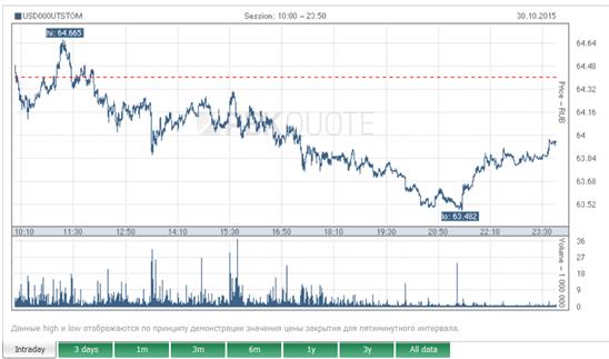 Biểu đồ tỷ giá USD trên sàn ngoại hối Moskva trong ngày 30/10/2015. Tỷ giá USD giảm nhẹ sau khi Ngân hàng Trung ương Nga tuyên bố giữ nguyên lãi suất cơ bản 11%