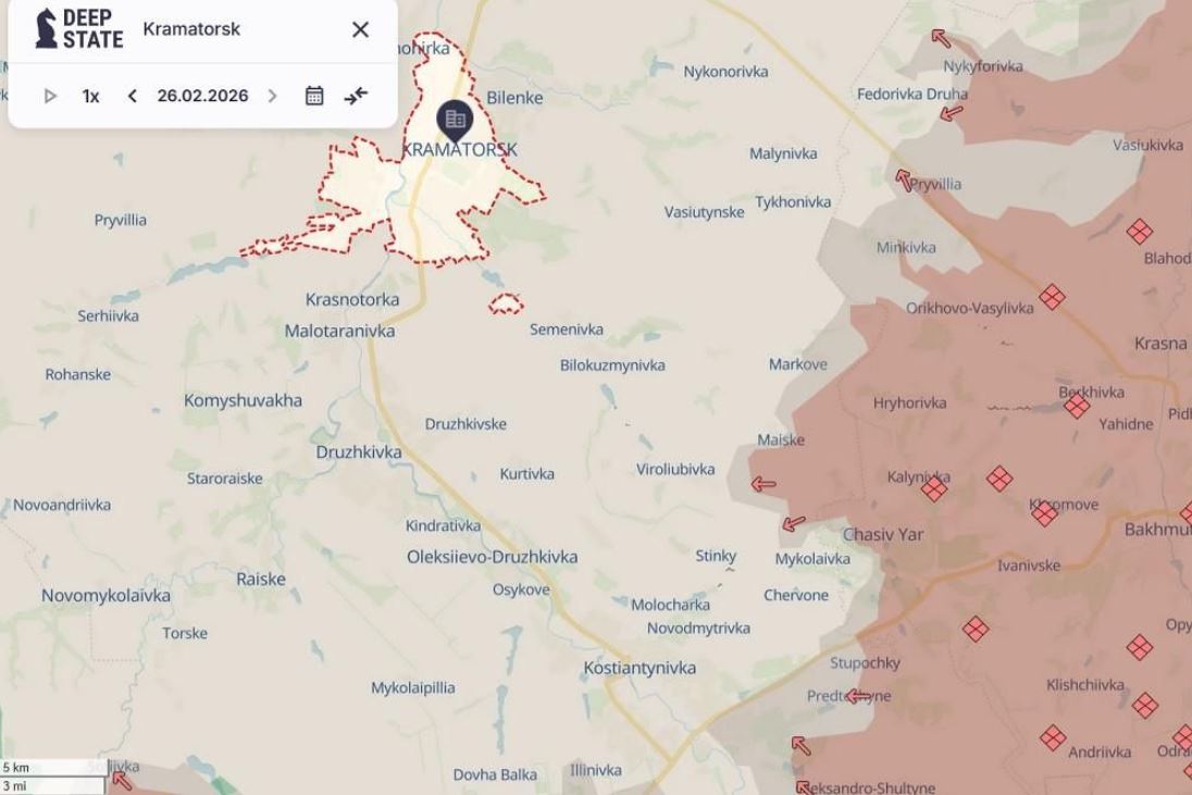 Theo bản đồ cập nhật hôm 26/2 từ chuyên trang theo dõi xung đột Deep State của Ukraine, Nga đang duy trì ít nhất 5 mũi tấn công cách thành phố Kramatorsk hơn 10km tại hai hướng đông và đông nam.