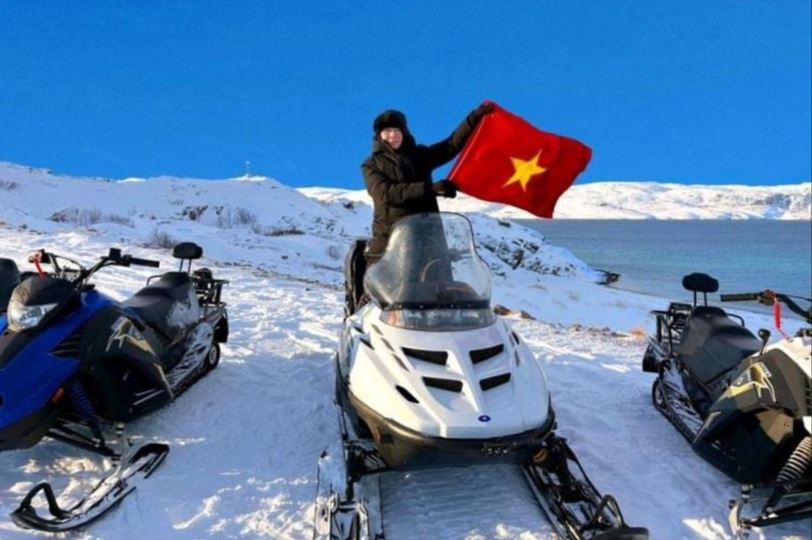 Cũng tại vùng Bắc Cực, Đoan Trường tự lái mô tô trượt tuyết ra bờ biển Barents để ngắm