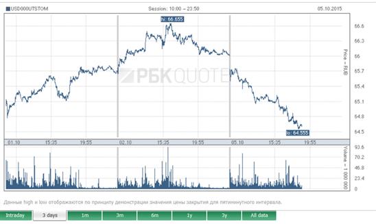 Biểu đồ tỷ giá USD trên sàn ngoại hối Moskva trong các ngày 1,2,5 tháng 10 năm 2015. Lúc 18:00 chiều nay, tỷ giá USD hạ xuống còn 64,55 rúp/USD, khoảng 19:00, giá bán sỉ USD tại các điểm bán ngoại tệ ở Moskva vào khoảng 65,3 rúp/USD
