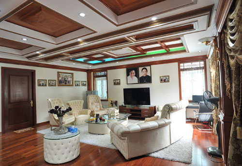 Phòng khách tại tầng trệt rộng rãi với điểm nhấn là trần nhà được thiết kế cầu kỳ, độc đáo. Bộ salon sang trọng cũng rất lạ, vợ chồng Trang Nhung kỳ công mới mua được.