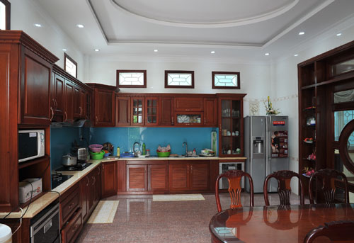 Gian bếp chủ yếu với nội thất gỗ, sang trọng và sạch sẽ.