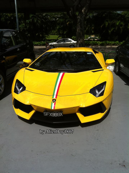 Mới đây, hình ảnh một chiếc Lamborghini Aventador LP700-4 màu vàng chóe sở hữu biển đẹp tại Singapore đã nhanh chóng lọt vào ống kính của một tín đồ xe hơi. Sở hữu bộ cánh màu vàng bắt mắt, chiếc Aventador còn được trang trí thêm vạch tem cờ Ý trên nắp capo. Tuy nhiên, độ khủng của chiếc xe còn nằm ở biển số xe cực đẹp: SFX 999 X. Được biết, tại Singapore, muốn sở hữu những biển số như thế này bạn cần phải bỏ ra số tiền không hề nhỏ.